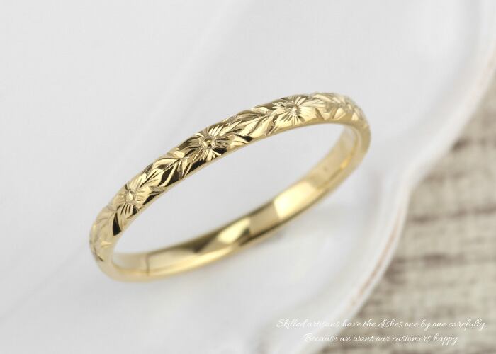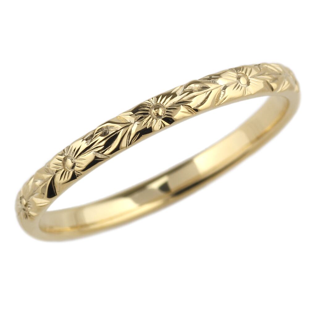 リング メンズ ハワイアンジュエリー 18金スクロール プルメリア 波 花 華奢 男性 K18ゴールド 彫金 手彫り 結婚指輪 刻印 プレゼント ギフト 誕生日 記念日 ボーナスセール