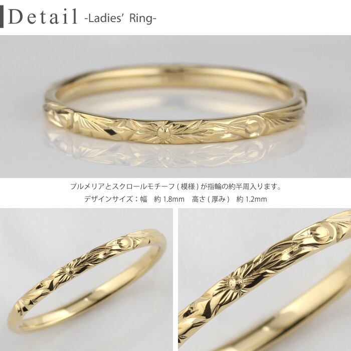 リング ハワイアンジュエリー レディース 18金スクロール プルメリア 波 花 華奢 女性 K18ゴールド 彫金 手彫り 結婚指輪 刻印 プレゼント ギフト 誕生日 記念日 ボーナスセール