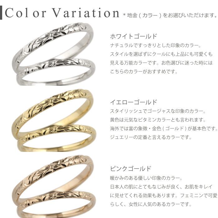ハワイアン ジュエリー ペアリング 10金 スクロール プルメリア 波 花 華奢 レディース メンズ 指輪 k18ゴールド 刻印 男性 女性 地金 彫金 手彫り 結婚指輪 プレゼント ギフト 誕生日 記念日 ボーナスセール